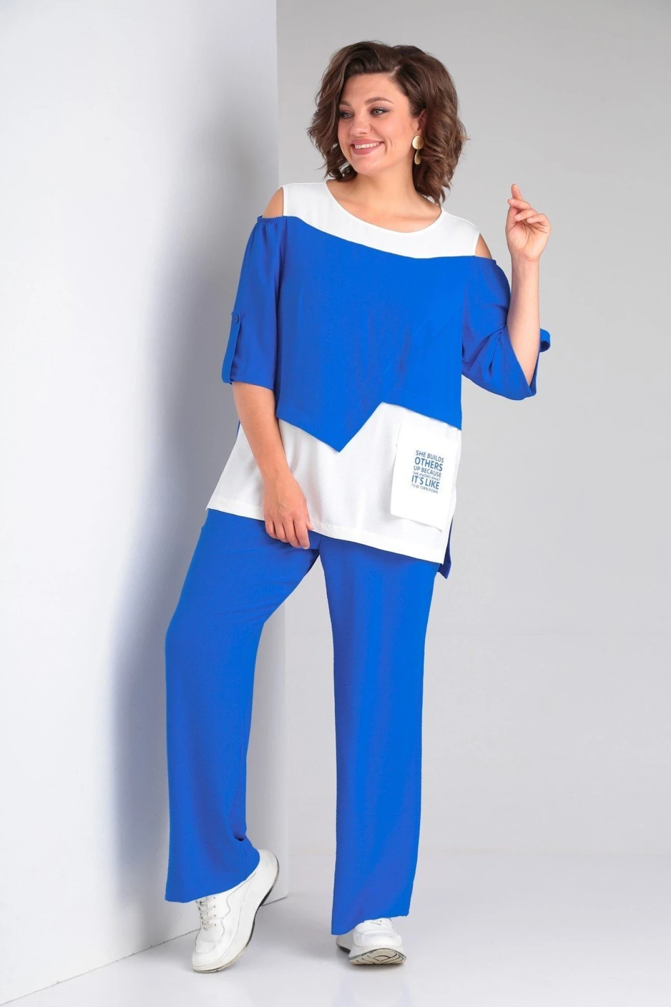 Комплект состоящий из брюк и блузы. Брюки прямого кроя с поясом на резинке, в боковых швах имеются карманы. Блуза свободного кроя с округлой горловиной, застежкой по спинке на пуговицу. Блуза комбинирована двумя цветами ткани. Рукав приспущен на предплечье, оформлен патой. Так же имеется накладной декоративный карман на левой стороне блузы. Спинка чуть длиннее, чем перед. В боковых швах разрезы