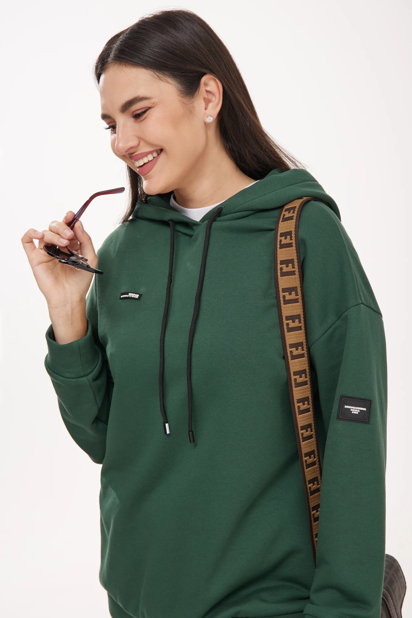 Худи прямого свободного силуэта со спущенным плечом и втачным рукавом. По груди и в области плеча -декоративные нашивки. Низ худи и низ рукава обработан притачной манжетой. Горловина худи с капюшоном, который регулируется декоративным шнурком.