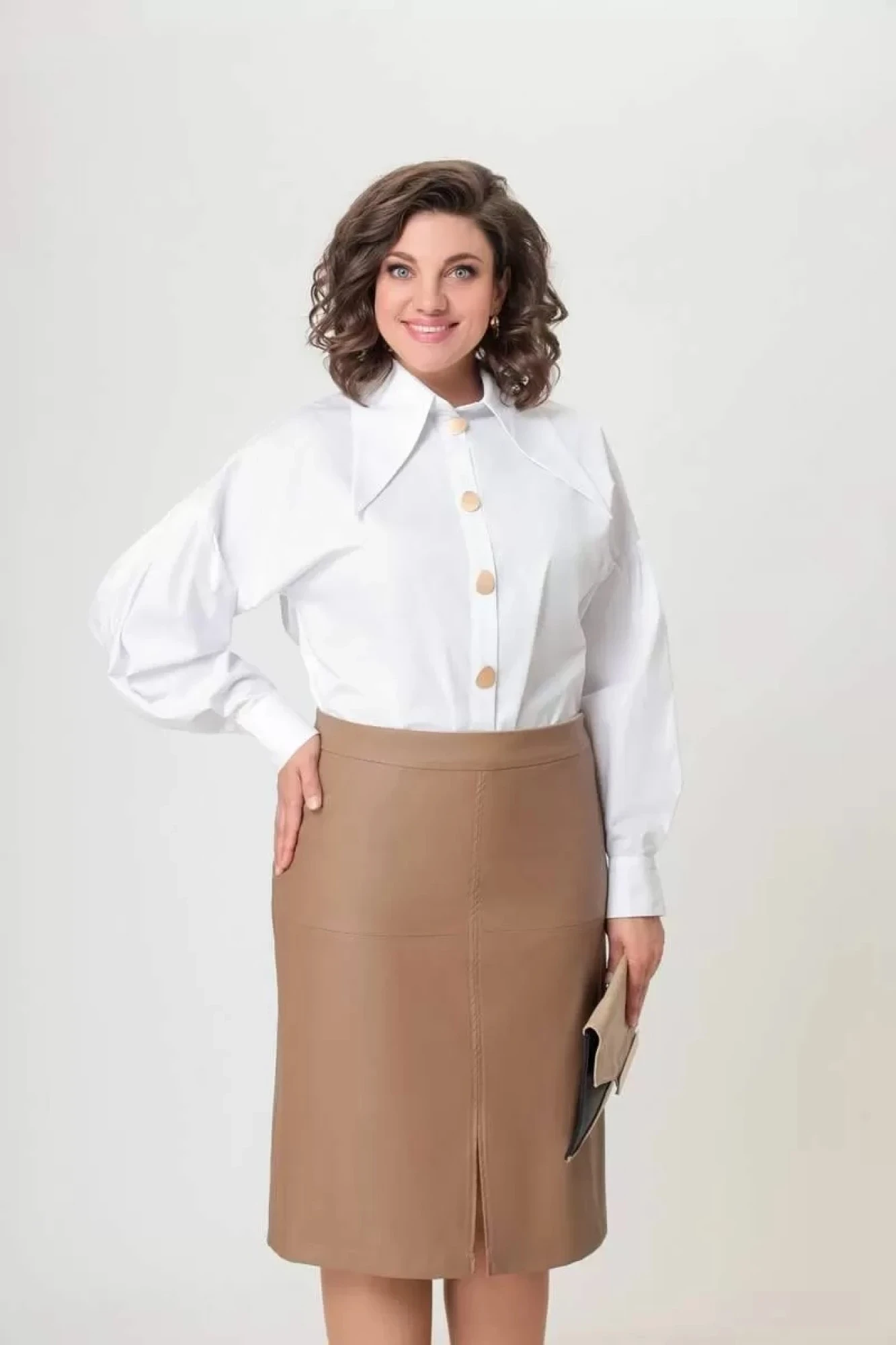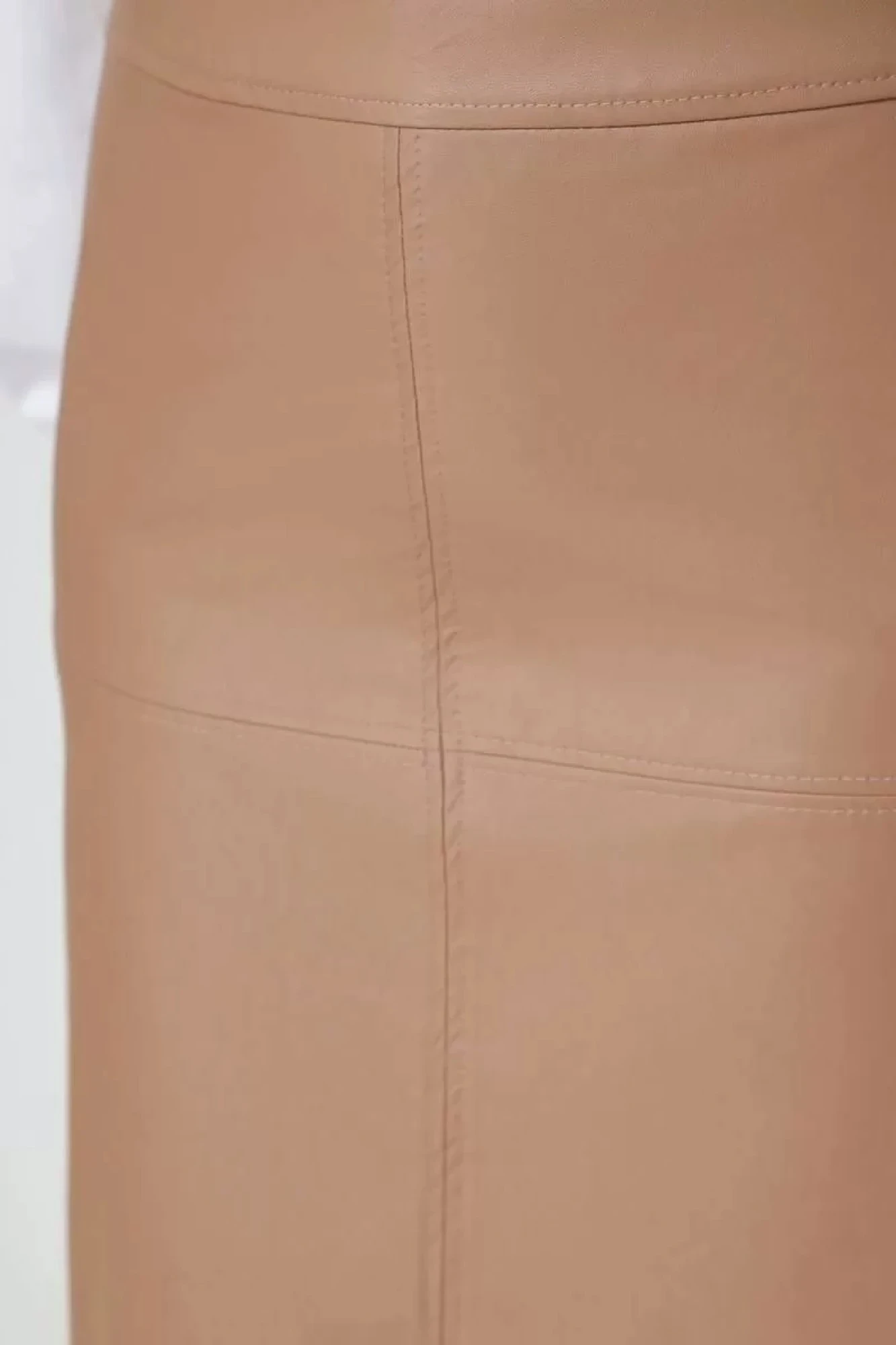 Юбка полуприлегающего силуэта, выполнена из экокожи на хлопковой основе. Юбка на подкладке. Перед и спинка со средним швом и горизонтальными рельефами, отстроченными отделочными строчками. По спинке юбки обработаны вытачки. Застежка на потайную молнию в среднем шве заднего полотнища. Верх юбки обработан притачным поясом. В среднем шве переда расположен разрез.