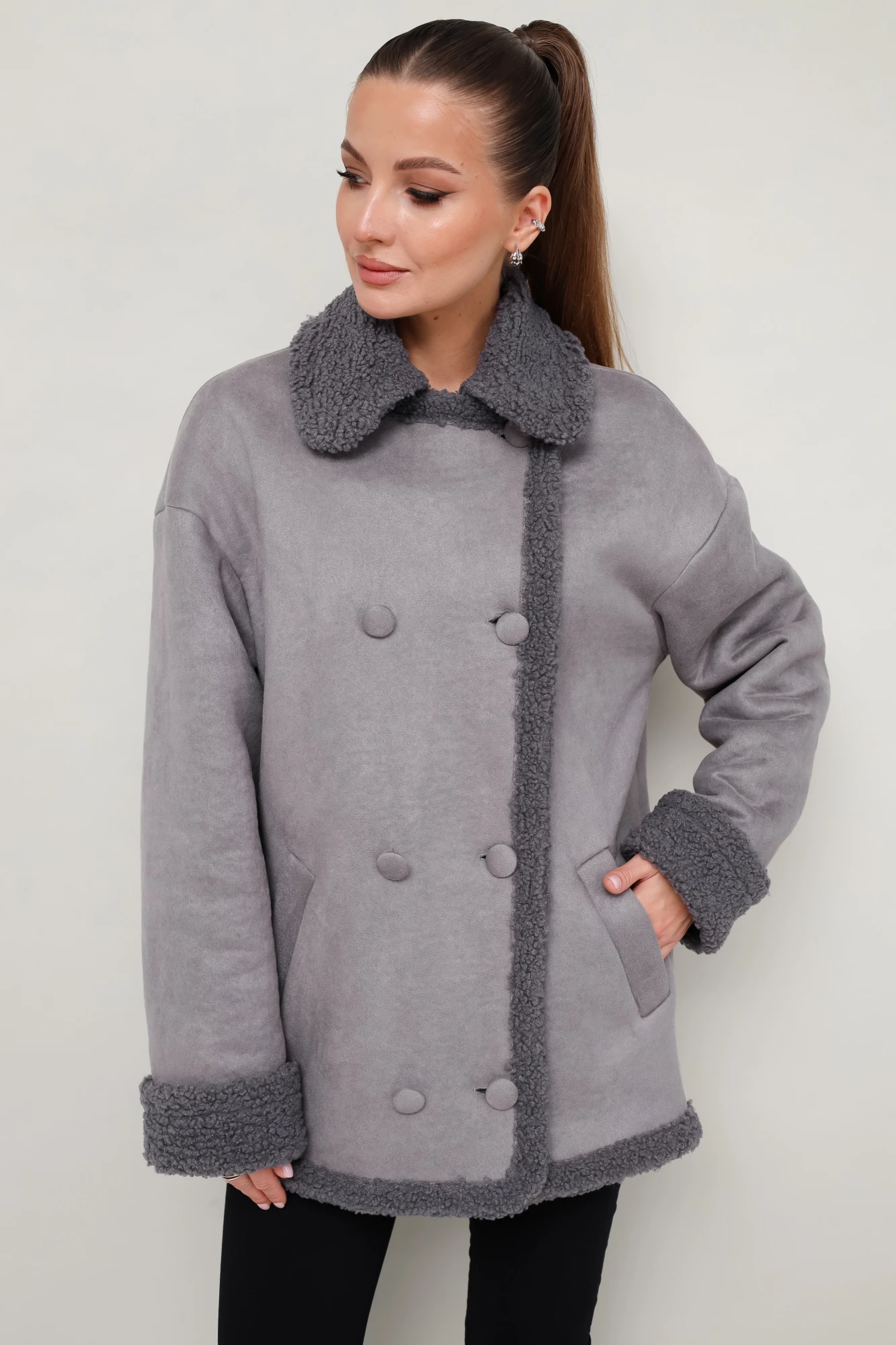Дубленка декорирована искусственным мехом, который придает образу благородную мягкость и уют."