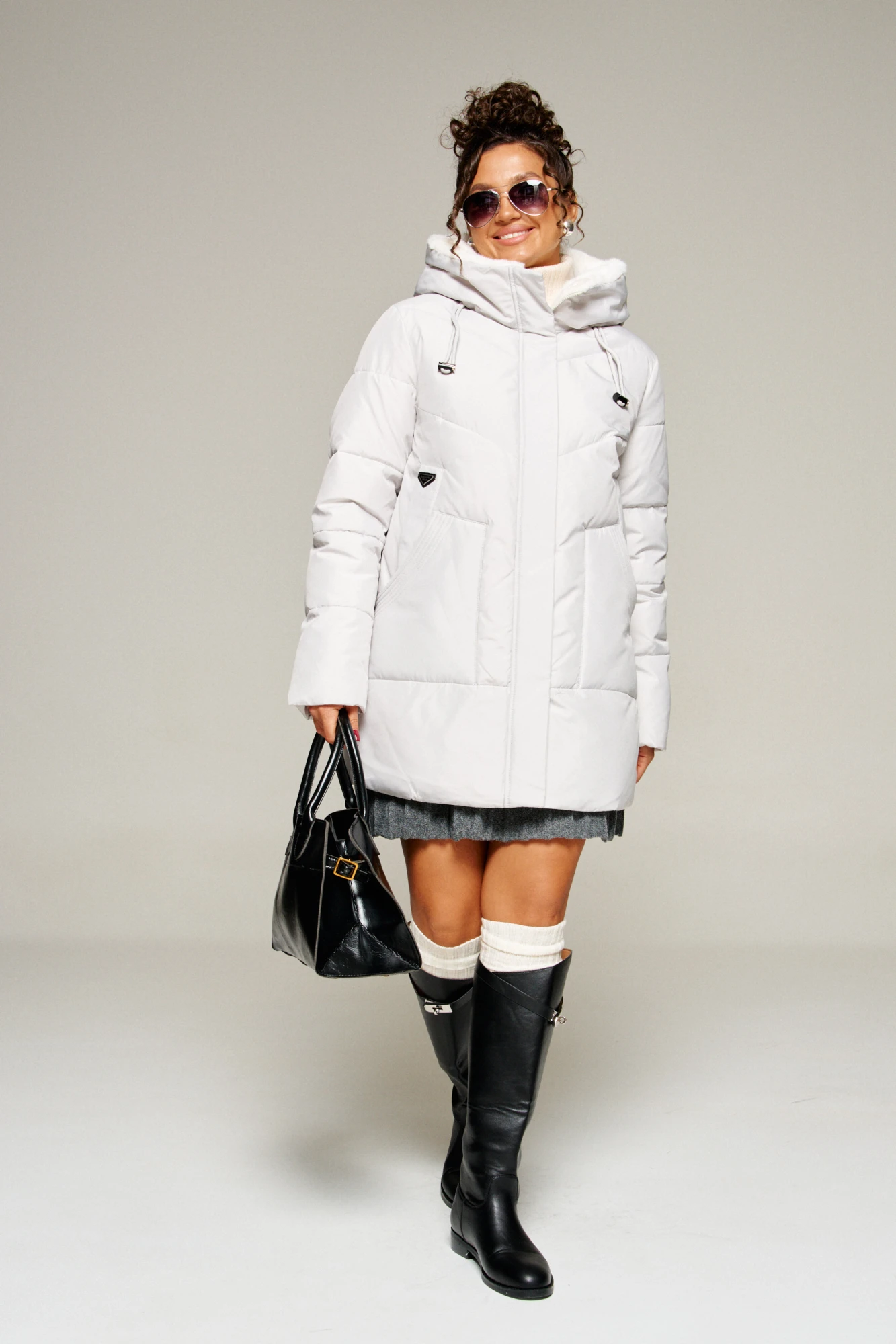 Капюшон с застежкой спереди умеренного объема. По периметру капюшона с внутренней стороны выполнена оторочка из искусственного меха, которая выполняет декоративную и защитную функции, создавая дополнительное тепло и защиту от ветра и холода.
