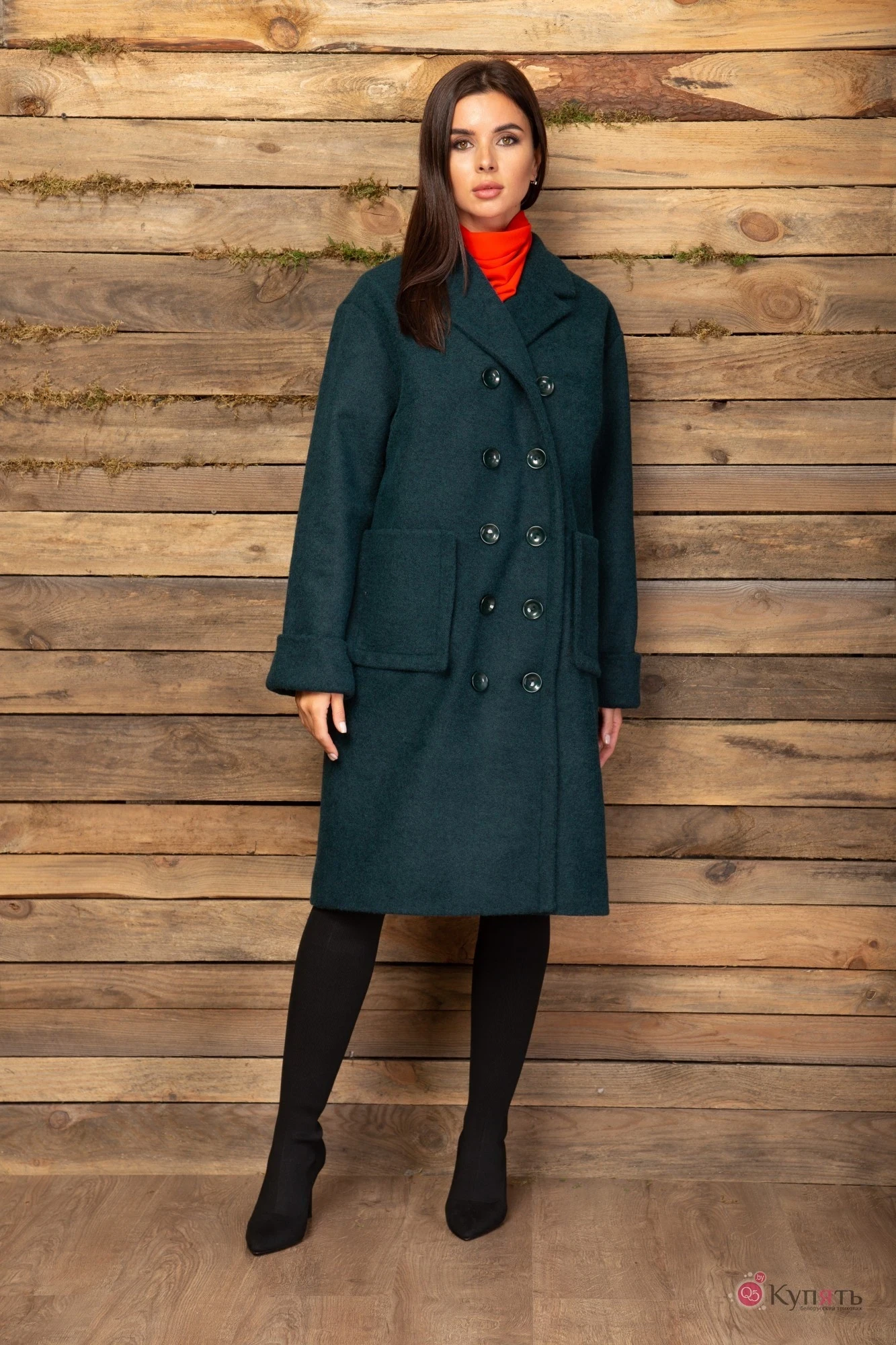 Демисезонное женское пальто свободного кроя со спущенным плечом, и двубортной застежкой на петли пуговицы. По спинке средний шов. По переду накладные карманы с декоративной отстросчкой. Декоративная отстрочка идет по воротнику и бортам. Рука одношовный прямой, отложная манжета. В комплект входит съемный пояс в цвет пальто.