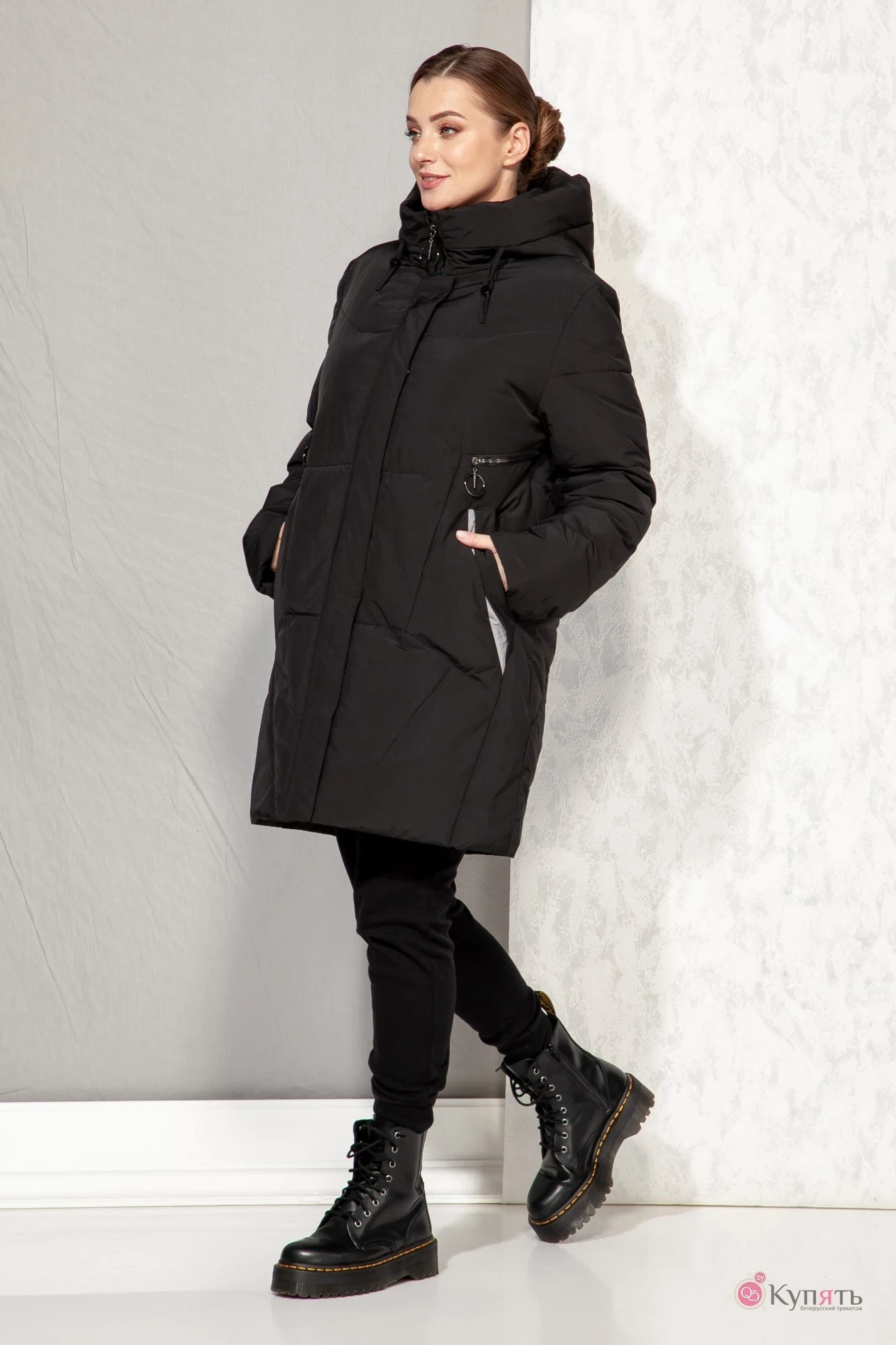 Полупальто со стойкой и объемным несъемным капюшоном. По краю капюшона предусмотрена утяжка с фиксатором.