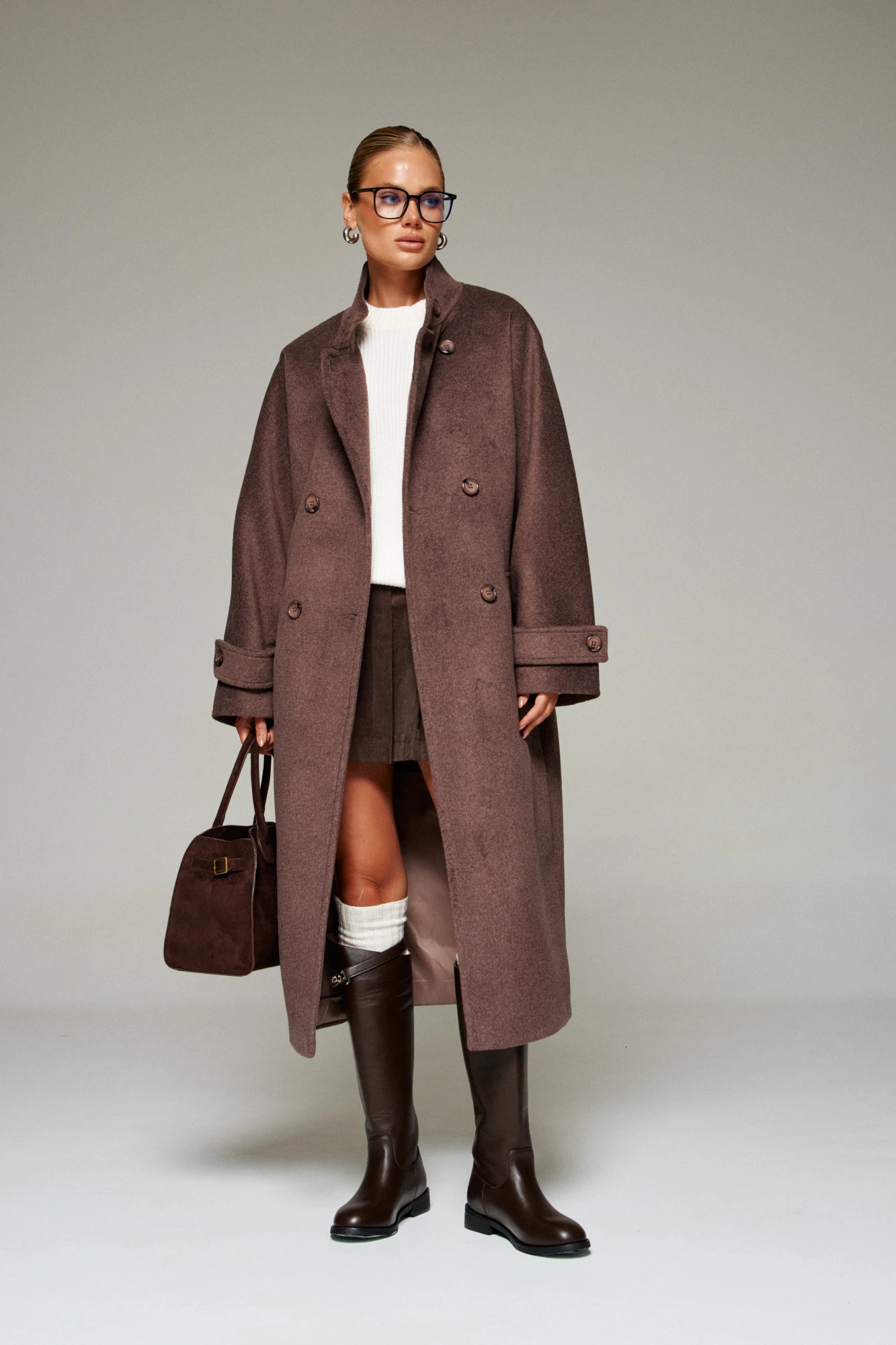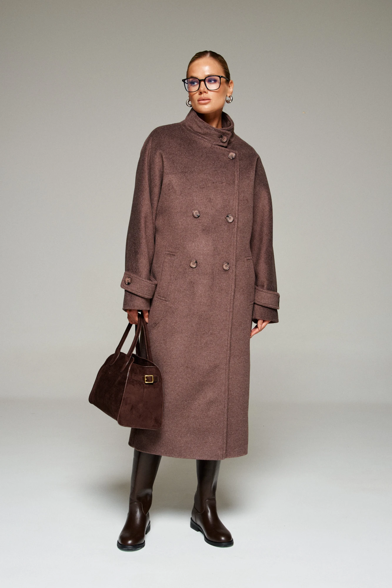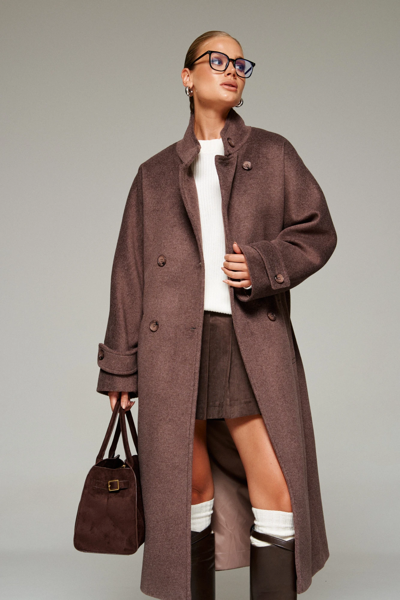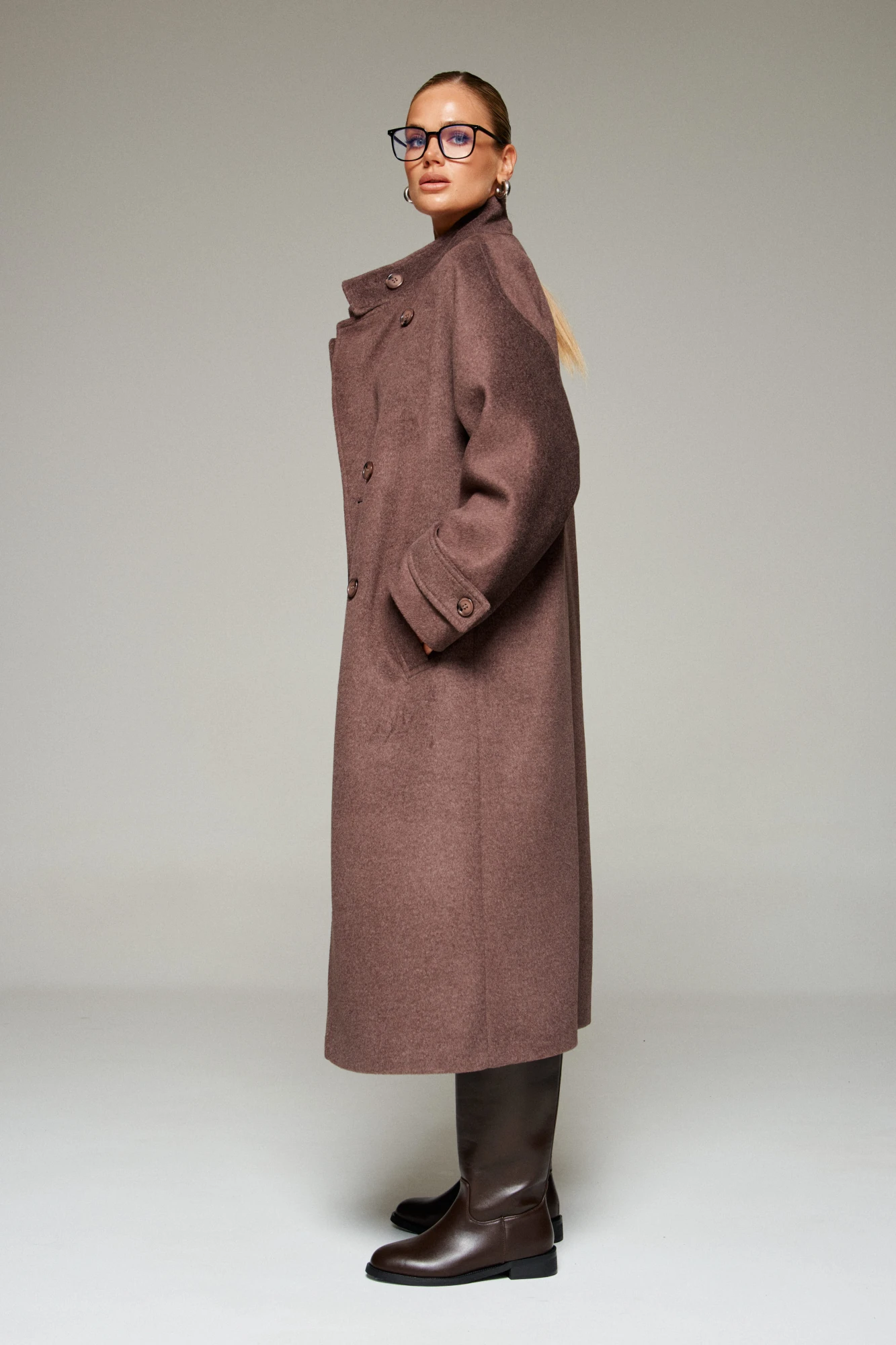 Пальто выполнено из шерстяной ткани, которая обеспечивает теплоизоляцию и защиту от ветра и влаги, подходит для межсезонья и теплой зимы. Двубортное, на подкладке. Изделие рассчитано на температурный режим от +10 до -5 градусов. Модель прямого силуэта актуального покроя «летучая мышь»; предназначена для повседневного использования.