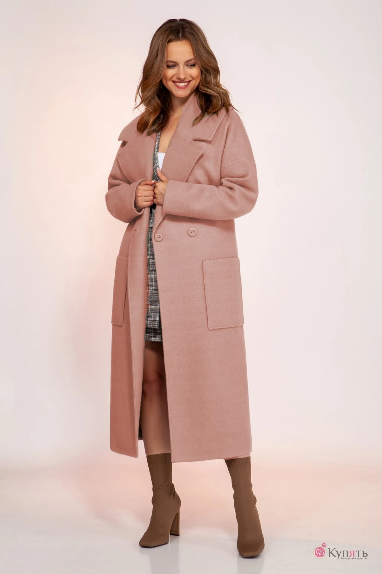 Перед с двубортной застежкой на один ряд пуговиц и воротником пиджачного типа, широкой формы. По переду настрочены большие накладные карманы. По карманам, бортам, лацканам и воротнику проложена отделочная строчка. Линия талии фиксируется поясом из основной ткани.