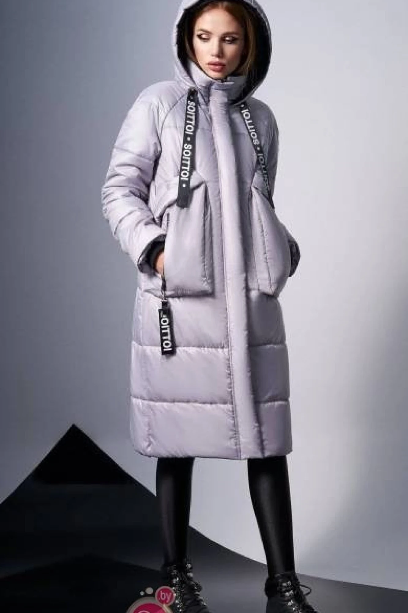 Пальто для зимы, утепленное Изософтом 200, прямого силуэта; рукав-реглан по низу дополнен трикотажной манжетой; по переду большие накладные карманы-портфели на молнии, с клапаном в подрезе сверху; застежка центральная на молнию с 2-мя бегунками, закрытая планкой; воротник - стойка. Пальто с несъемным капюшоном, дополненым кулисой с оригинальной широкой лентой; по спинке - подрез с оригинальным принтом; декоративный элемент на кармане - съемный