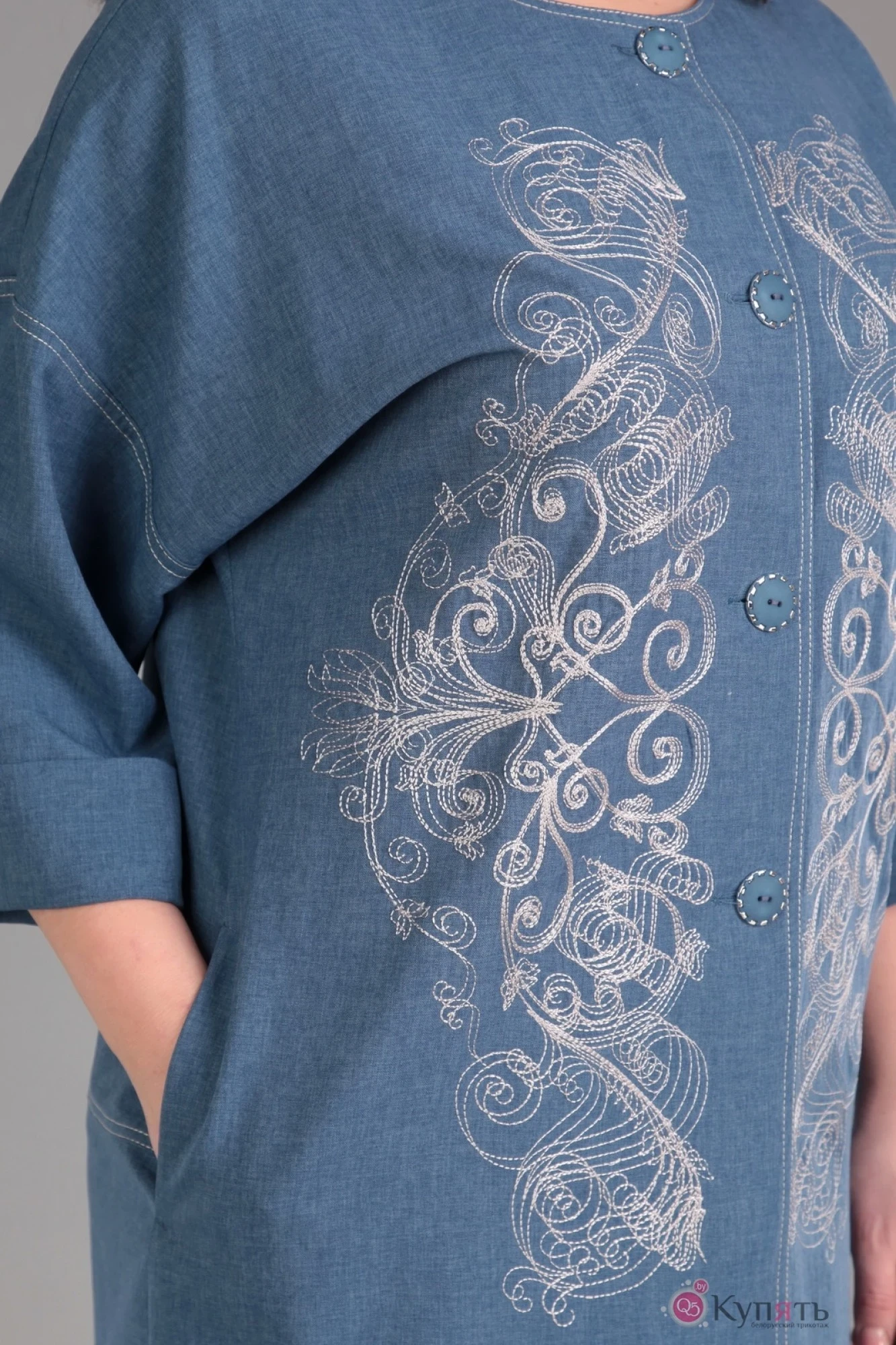 Пальто женское из ткани "лён вишер", прямого силуэта с цельнокроеным рукавом. На полочке вышивка с эффектом "3D". Спинка с отрезной деталью и шлицей по низу. Низ рукава на манжете. Застежка на петли пуговицы. По рукаву отрезная линия. По краю борта,карману,отрезной детали рукава и спинке отделочная строчка.