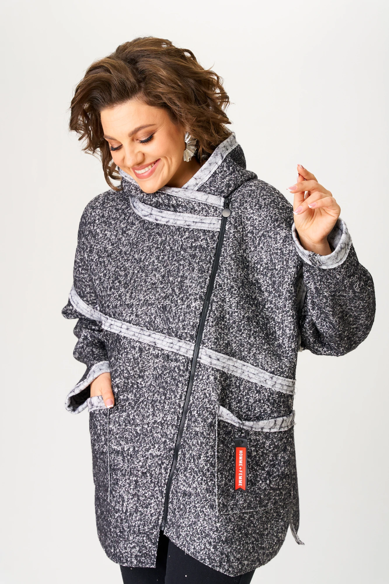 Женское полупальто для повседневной носки выполнено из тонкой шерстяной пальтовой ткани. Полупальто свободного кроя с капюшоном, внутренняя часть которого выполнена из контрастной ткани. Также из контрастной ткани выполнены и дополнительные элементы на изделии. Плечо спущенное, рукав длинный втачной. Перед изделия с асимметричной косой застежкой на разъемную тесьму-молнию. Спинка прямая цельная. Полупальто украшено рельефными швами срезами наружу. По переду накладные карманы, на одном из которых в качестве декора используется съемный брелок. Низ изделия разноуровневый с необработанным краем. Полупальто смело сочетается с любым низом (юбка, брюки, джинсы) и обувью. Длина по спинке 75 см, длина рукава от горловины 74 см. Изделие подойдет на рост 170 см.