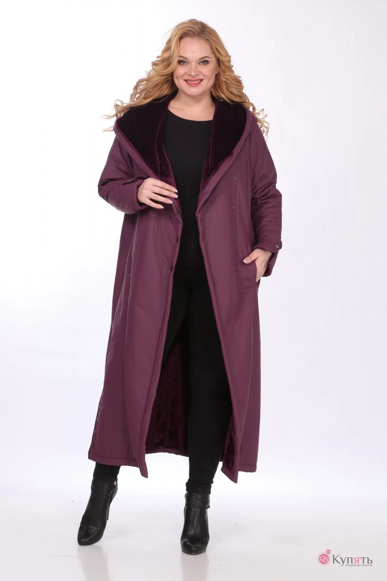 Пальто без утеплителя и подкладки, изнанка - экомех. Выполнено из мягкой непромокаемой ткани. Все кнопки на изделии металлические.