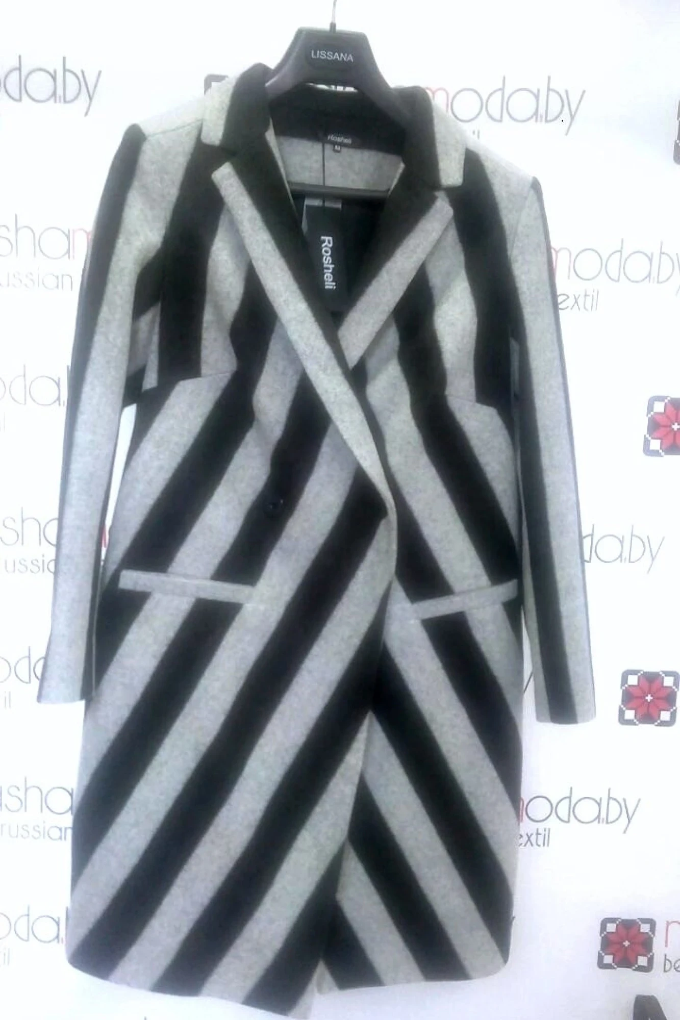 Пальто из шерстяной ткани на подкладке. Силуэт прямой, слегка зауженный к низу, борта скошены. Сочетание конструктивных линий и рисунка ткани выглядит абсолютно необычно. Пальто с нагрудными вытачками по переду и рельефами от плечевых швов до линии бедер по спинке. По переду- кокетки от плечевых швов, прорезные карманы с листочками. Воротник английского типа с закругленными углами. Рукава втачные, двухшовные. Застежка двубортная на одну декоративную и одну потайную пуговицу.
