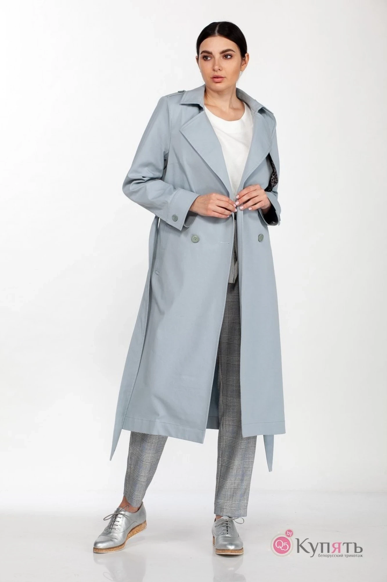 Тренч женский, свободного силуэта. Выполнен из хлопкового джинса с центральной двубортной застежкой на петли и пуговицы. Рукав двушовный втачной. Воротник пиджачного типа. Карманы по переду обработаны листачками. По линии талии шлевки, в который протянут съемный пояс. По левой стороне отлетная кокетка с нагрудным карманом. Отлетная кокетка по спинке. На плечевых швах обработаны паты, с декоративной пуговицей.