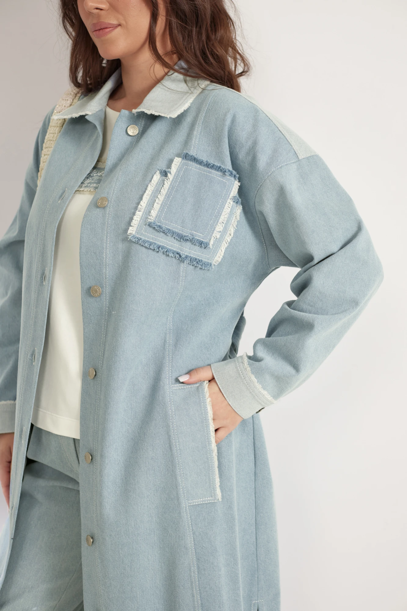 Стильных и универсальный предмет гардероба - джинсовый плащ (тренч) свободного кроя, без подкладки, с центральной застежкой на металлические пуговицы. Выполнен из качественного джинсового полотна. Плащ дополнен съемным поясом, выполненным из основной ткани, а так же удобными боковыми карманами. Рукав спущен. Длина плаща от плечевого шва 125 см Длина рукава 61 см