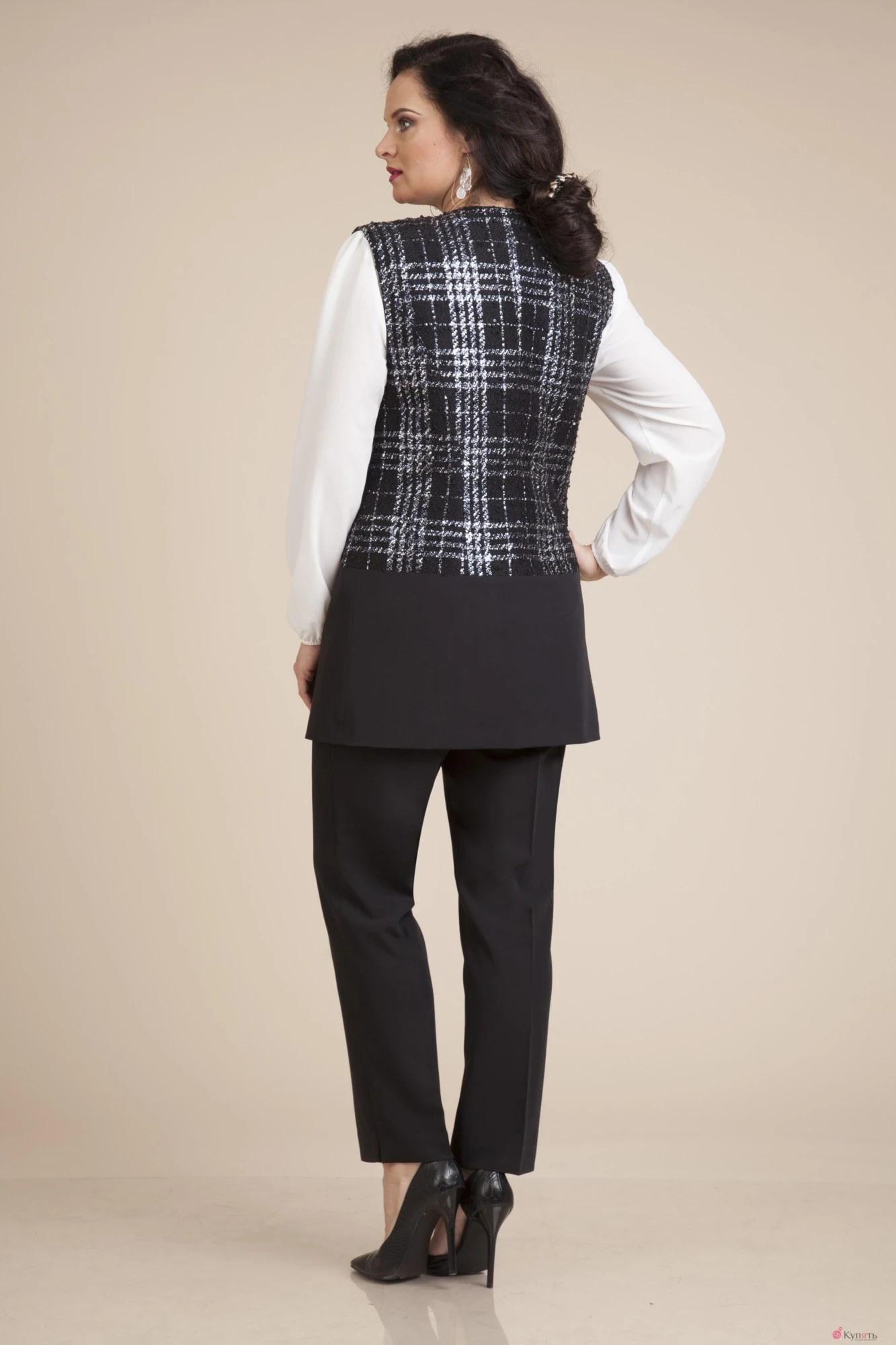 Эффектный комплект состоящий из модного в этом сезоне удлинённого жилета и блузки. Жилет на застежке встык, с округлой линией горловины, выполнен в сочетании костюмной и меланжевой утепленной ткани в клетку. Модель отрезная по линии бедер с прорезными карманами; на подкладке.