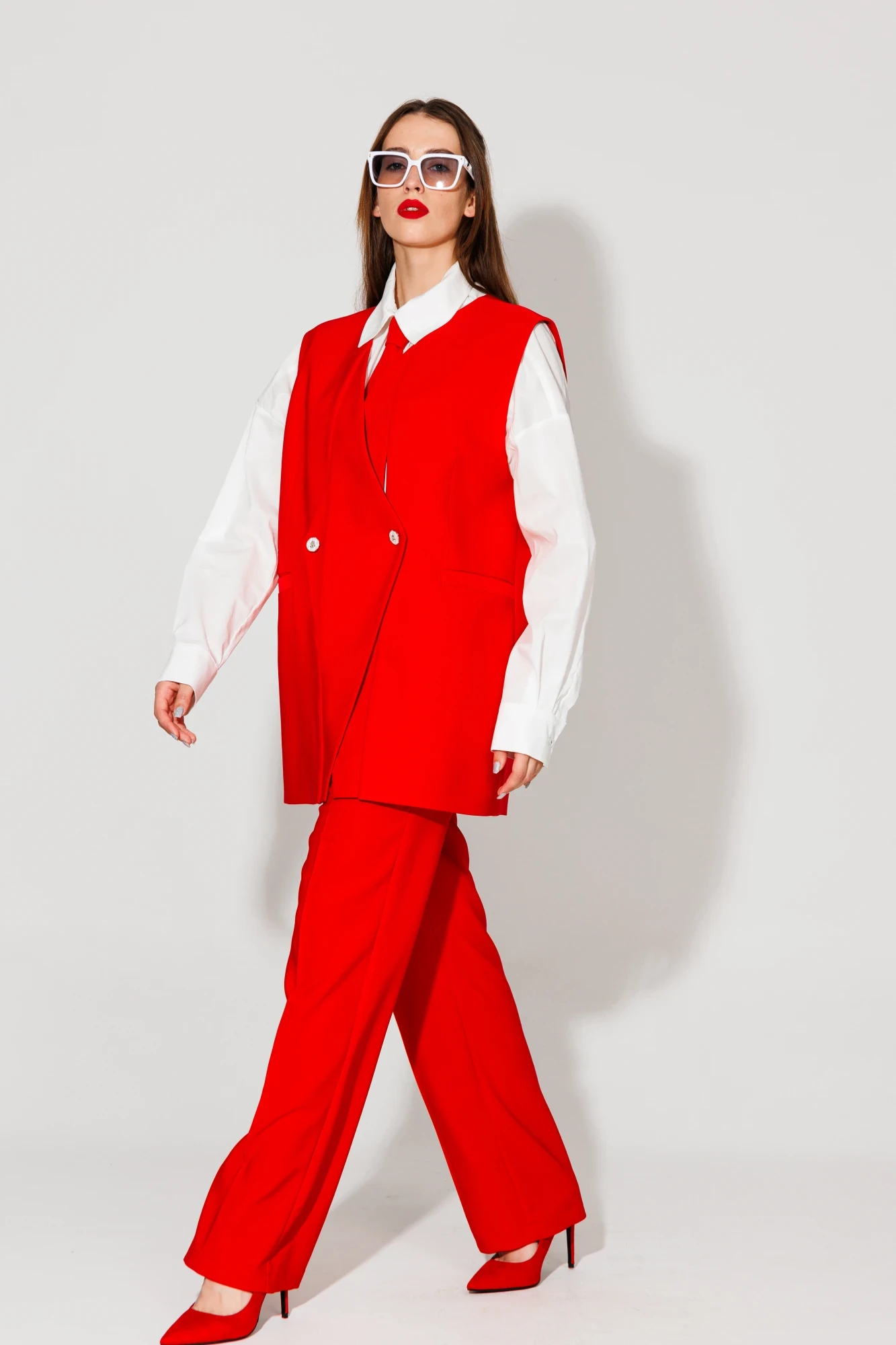 Жилет двубортный прямого кроя объёма оверсайз. Застёжка фигурная на петли и пуговицы. Карманы - листочки.