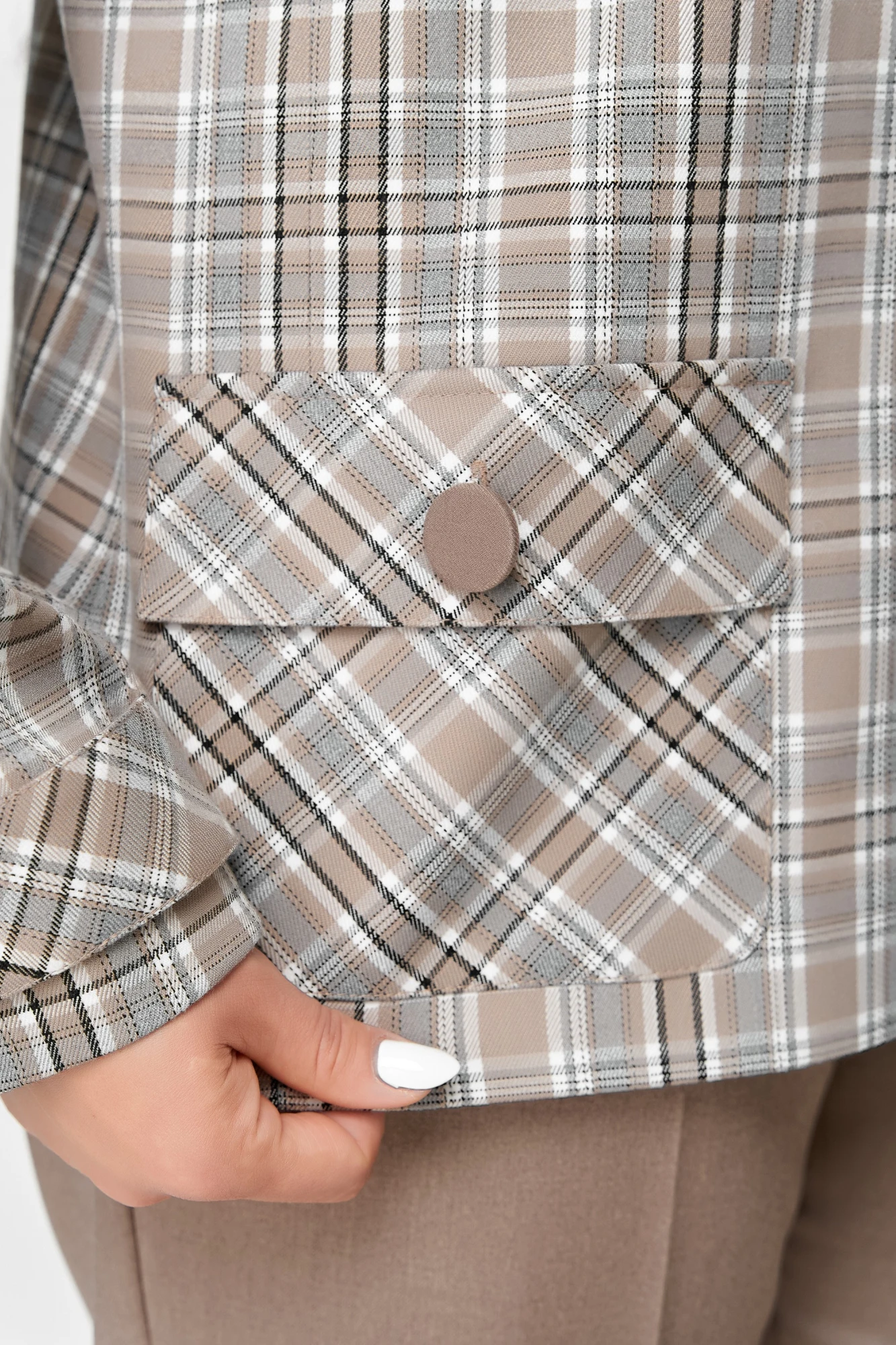 Клетчатая ткань, подчёркнутая декоративным кантом, создаёт эффектный образ с налётом классики.