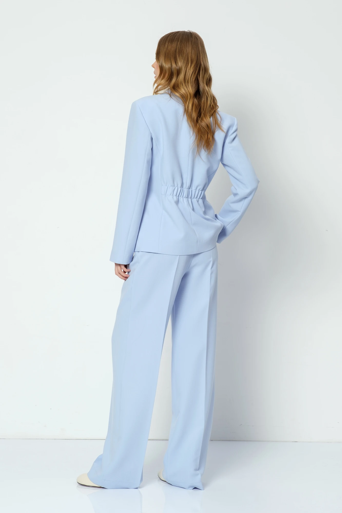 Укороченный приталенный жакет со складками. Детали: пиджачный воротник, перед с функциональными карманами, застежка на одну петлю и пуговицу, рукава втачные двухшовные, спинка с рельефами и резинкой по талии, на подкладке. Длина по спинке около 64 см в размерах 40-46 и около 67 см в размерах 48-52, длина рукава около 61 см