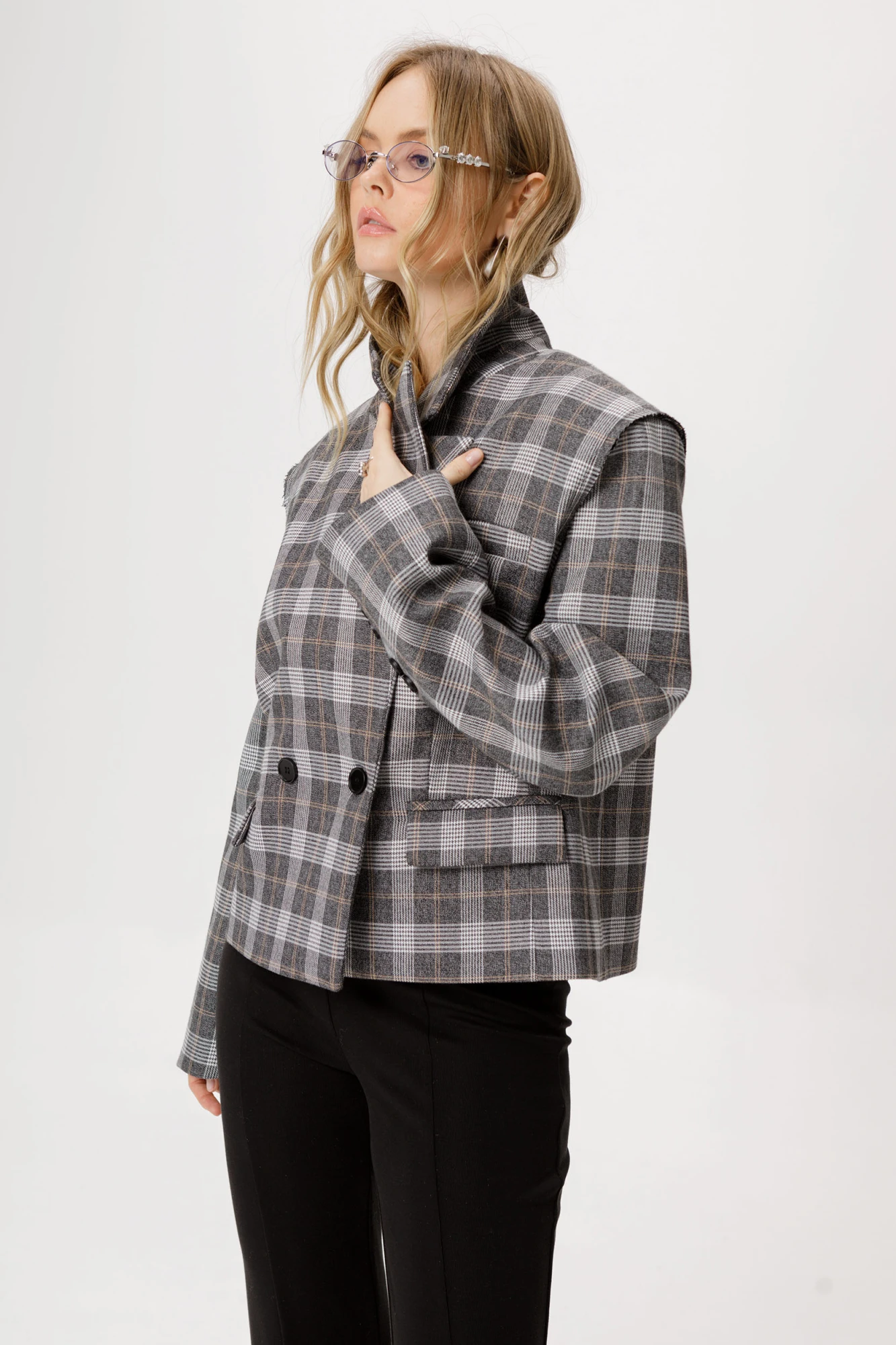 Детали: жакет прямого силуэта, пиджачный воротник, двубортная застежка на две петли и пуговицы, функциональные карманы, спинка с фигурной кокеткой, рукава втачные, жакет на подкладке.