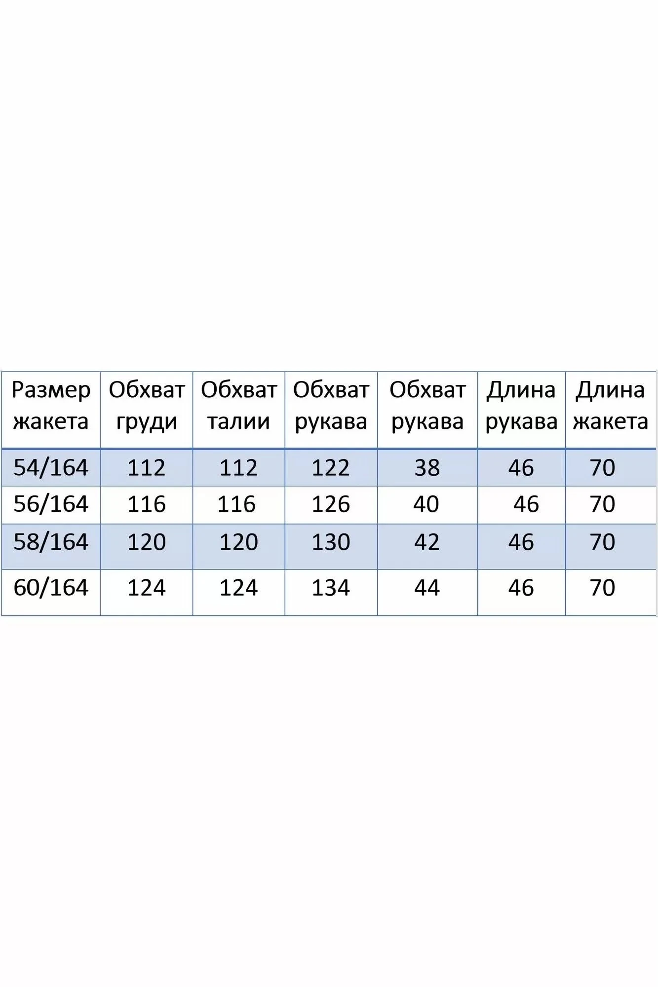 Жакет длина по спинке 71см, длина рукава 45см, ширина рукава на уровне глубины проймы 54-19,5см, 56-20см, 58-20,5см, 60-21см.
